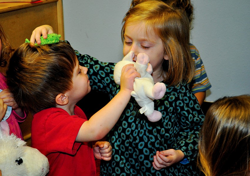 "What's mine is yours": Luke Stanaland and Laura Donovan show off their favorite stuffed animals during playtime.