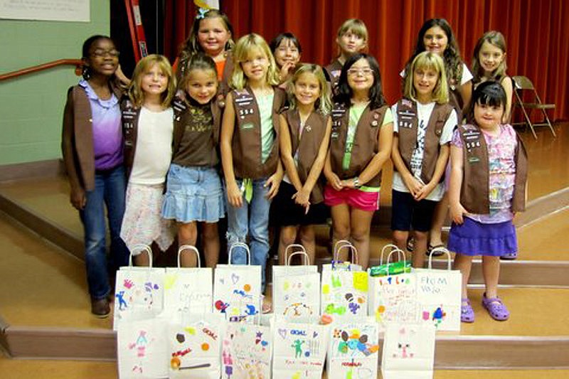 Thirteen girls joined forces to fill bags they decorated with homemade joke and coupon books, as well as with toys and games.
