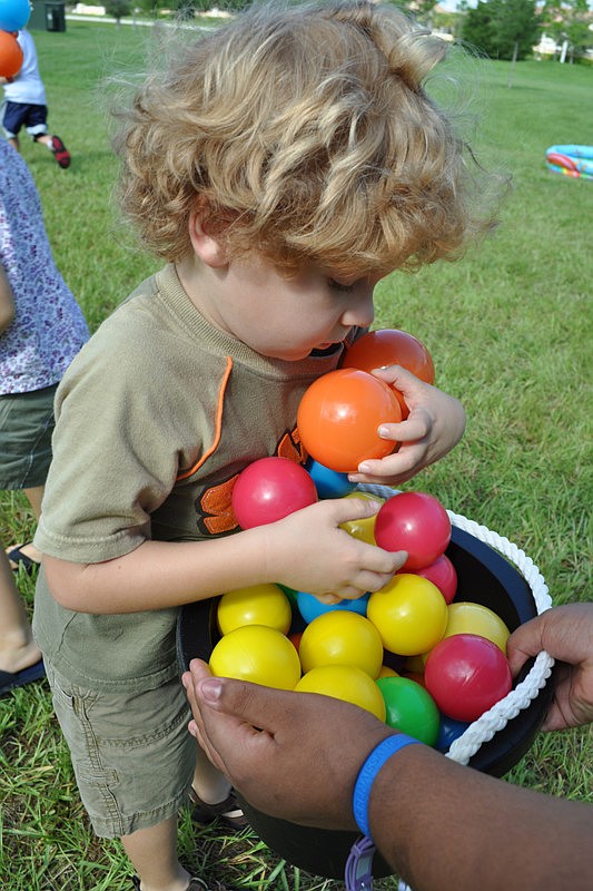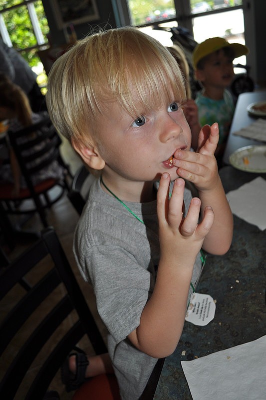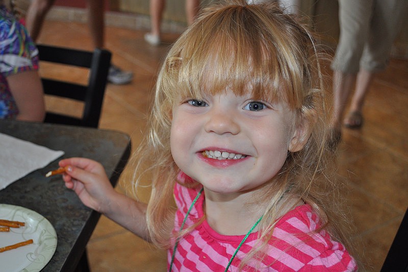 Grayson Best feasted on orange slices and pretzels as a snack.