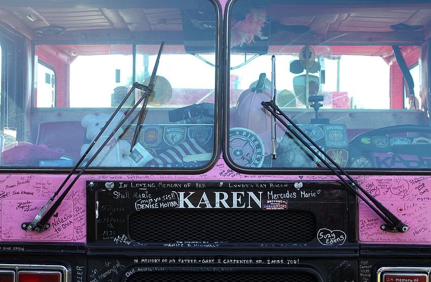 Danny Baughman and Dave Graybill pose in front of "Debbie," at pink firetruck covered in signatures. Each truck is usually named for a woman who has had cancer and had an impact on the community. "Debbie" is Baughman's mother-in-law.