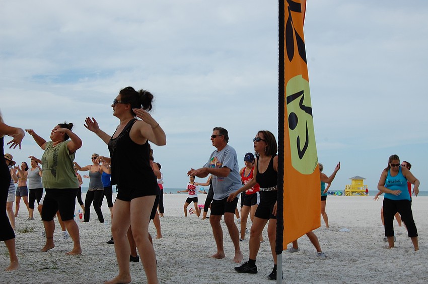 The Zumba class brought dancers as well as curious onlookers. Here Luz Ruiz-Tagle shouts encouragement to participants.
