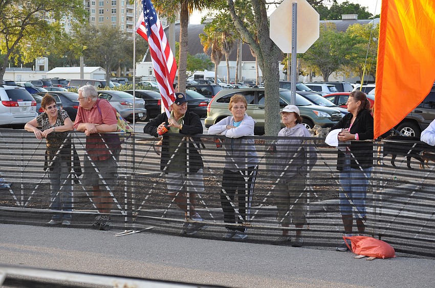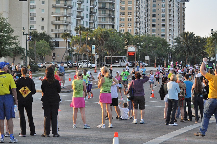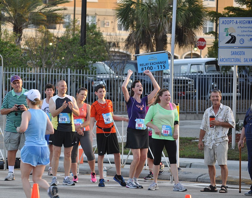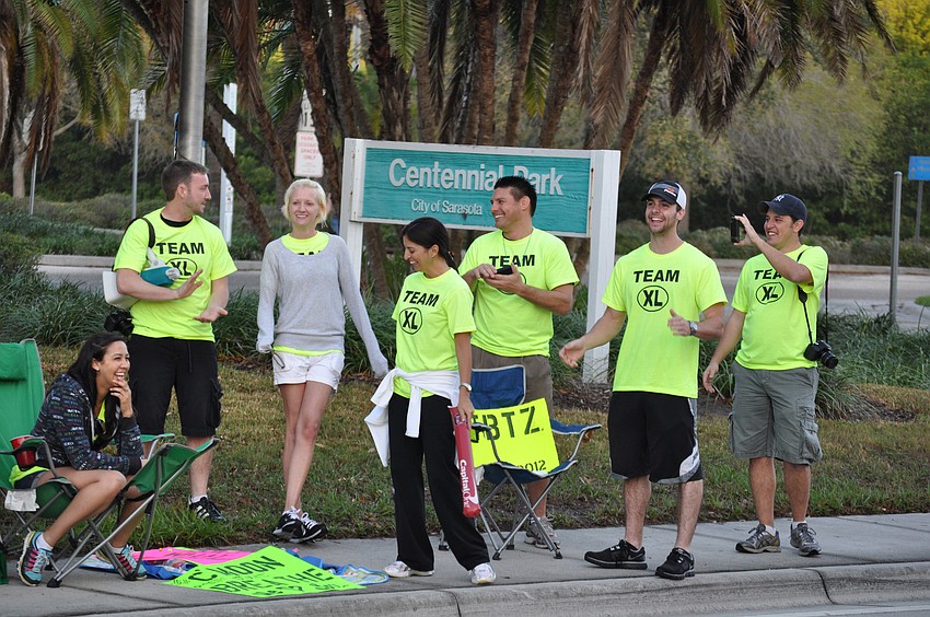 Hannah Hrobos, Danielle Hostings and Kim Knox cheered on runners dressed as breakfast foods.