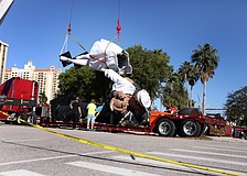 The larger-than-life sculpture was removed in April, after a woman driving a four-door white Mercedes Benz smashed into the base of the statue, causing enough damage to the structure to force it to come down. It was shipped to Johnson Atelier, a New Jersey studio that fabricates and installs art sculptures.