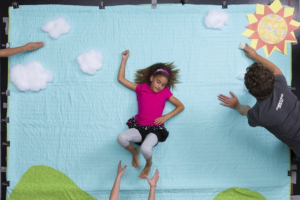 8-year-old Marissa Smith was the center of all the creative energy. A vibrant outdoor scene, complete with rolling hills, sunbeams and blue skies filled the area around her. The only catch was that, like sidewalk art, the pastoral picture was on the ground, and Marissa was, in fact, lying on her side.