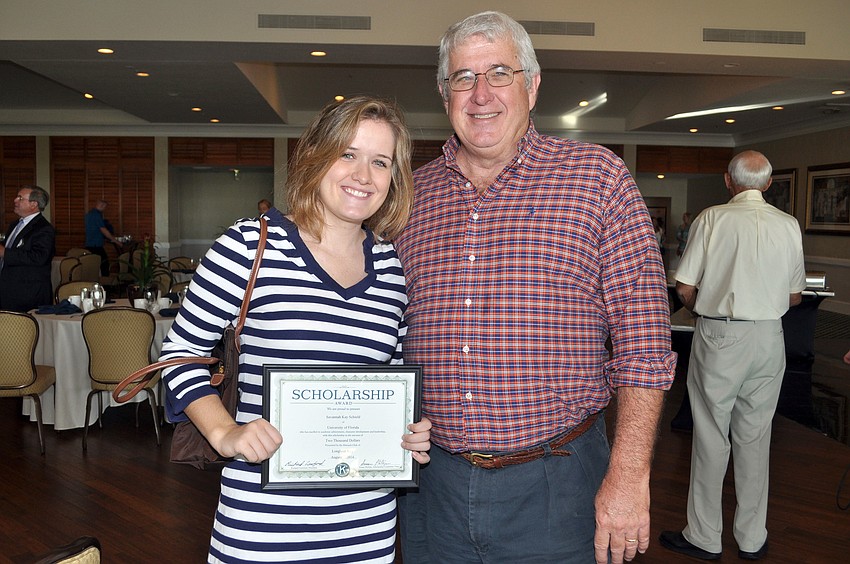 Sarah Falls, University of Florida, is awarded an academic scholarship by Scholarship Committee Chair Susan Philips and Longboat Kiwanis Club President Richard Crawford.