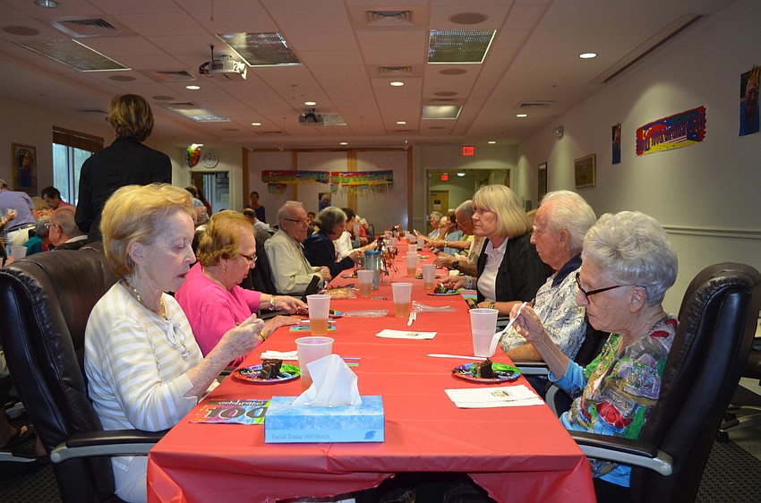 Carolyn Keller and Sylvia Weiss have cake. "I'm so happy to celebrate Sol's birthday," says Weiss.