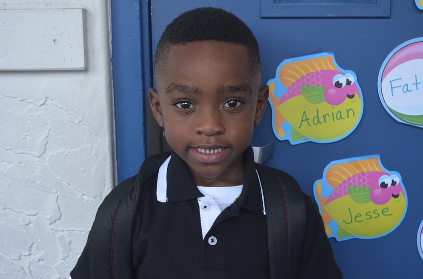 "I like drawing and cutting out things," says Caleb Moreland as he waits outside his classroom.