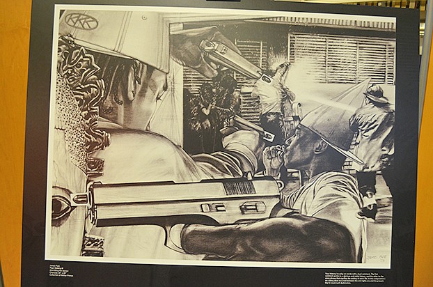 His latest series, "Kin Killing Kin," is a collection of charcoal drawings, which he created over the course of approximately 10 years in an effort to address the issue of black-on-black violence. The provocative drawings contrast historical imagery with modern gang culture and include metaphorical references to the Ku Klux Klan, a nod to the adage that black-on-black violence is putting the Klan out of of businesses, Pate says.