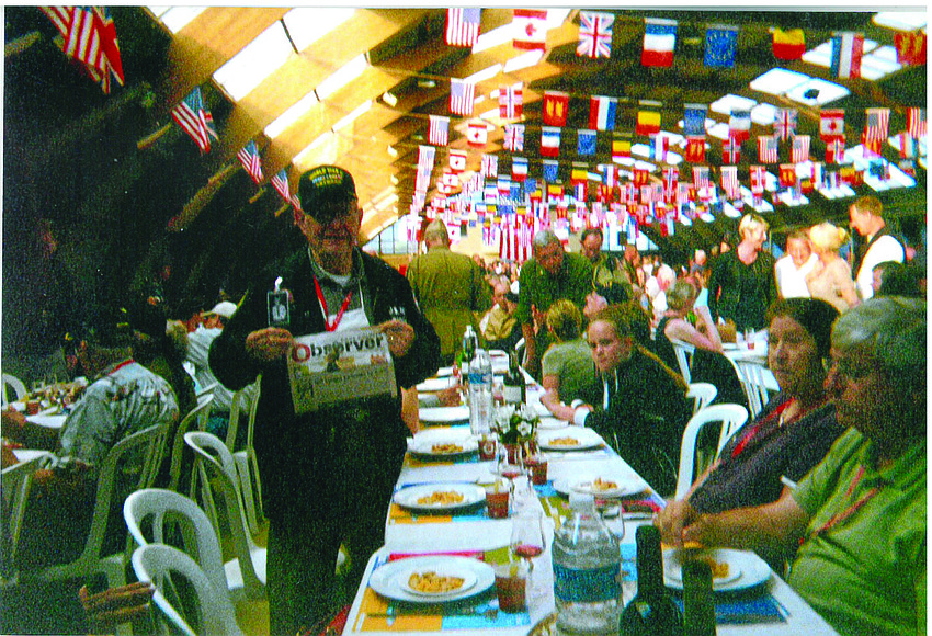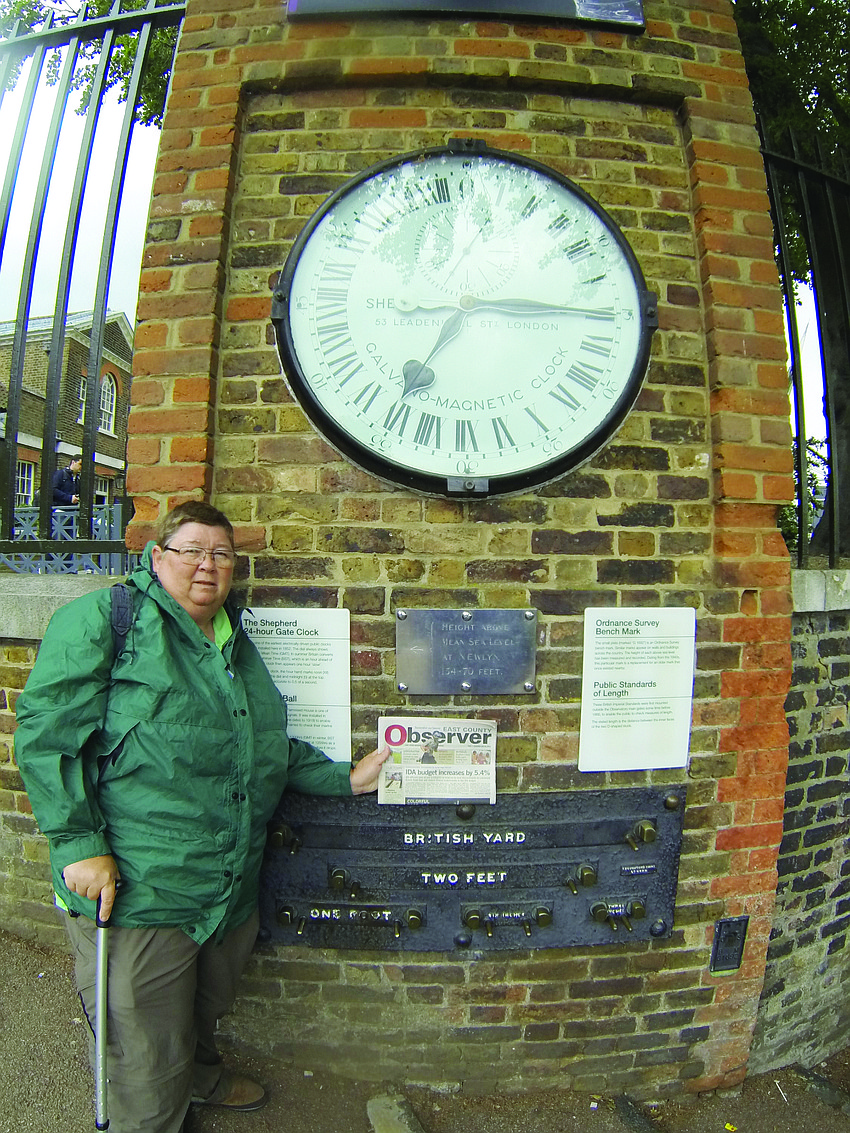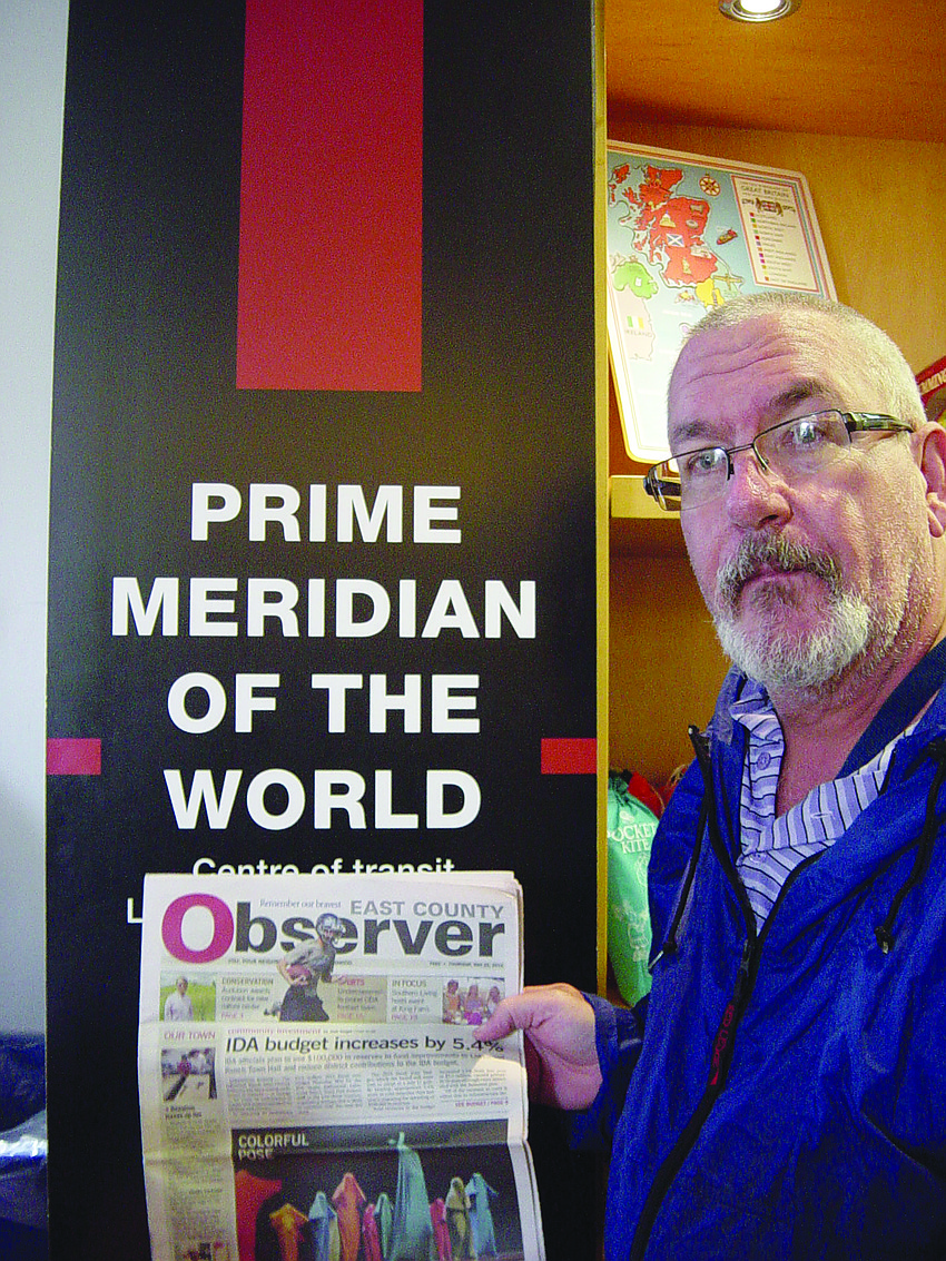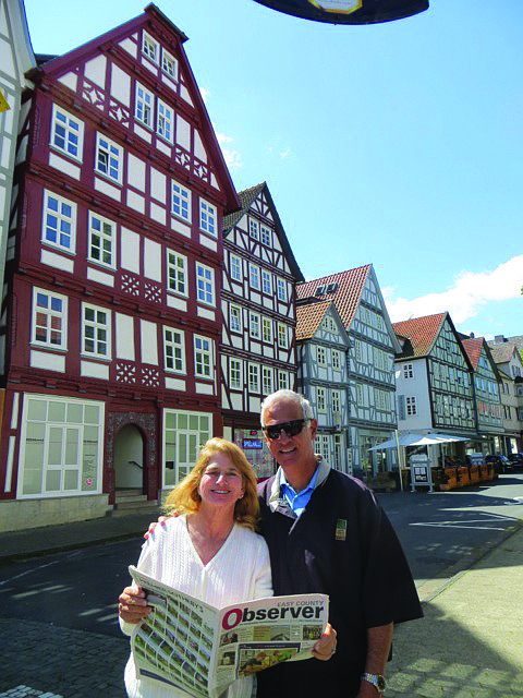 FAMILY FOCUS. Dennis and Karla Reens read their East County Observer in front of Karla’s dad’s home from the 1920s in Melsungen, Germany. His home was rebuilt into a hotel, where the couple stayed on their visit.