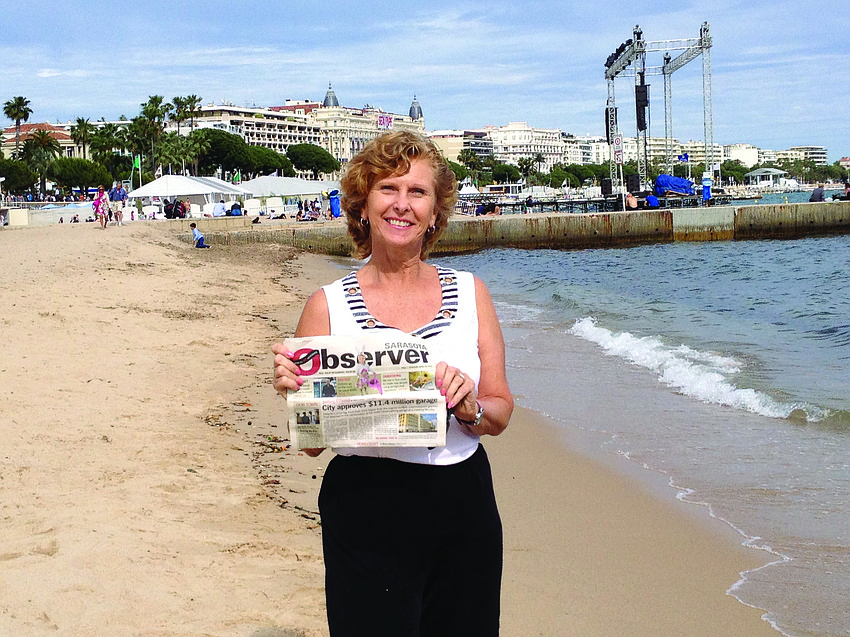 DO THE CANNES CANNES. Jean Lolli brought her Observer along to the French Riviera during the annual Cannes Film Festival. One of the outdoor movie screens is set up in the background.