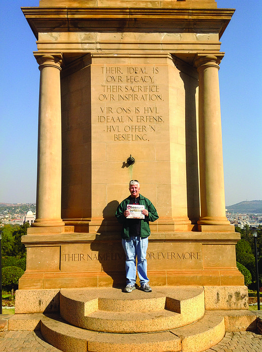 MEMORABLE TRIP. Rudi Kleer reads his copy of the Sarasota Observer in front of the Delville Wood South African National Memorial at the Union Buildings in Pretoria, South Africa.