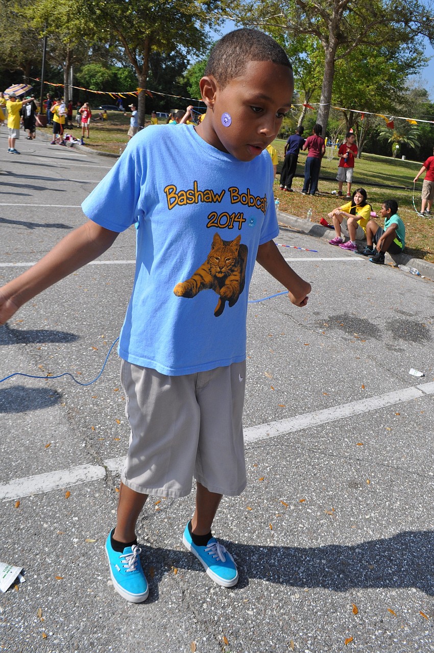 Zamaria Roberts, 8, does the "YMCA" while jumping.