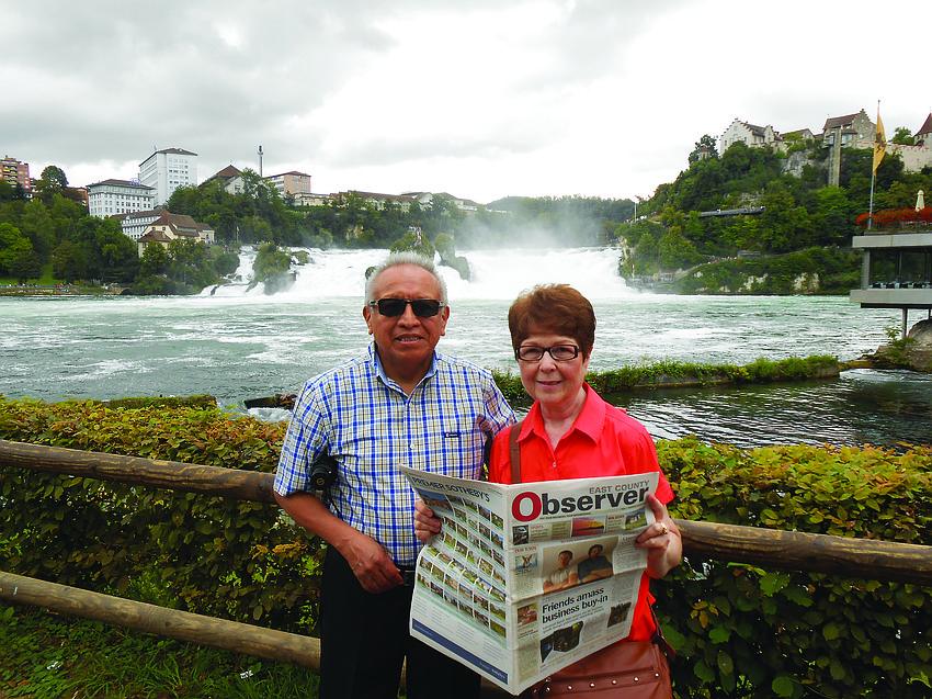 WATER WONDER. Carlos and Toni Shapiama pose in front of Europe's largest waterfall, formed nearly 17,000 years ago in the Rhine River. The couple toured medieval towns in Switzerland and France with their son, who lives in Lausanne near Lake Geneva.