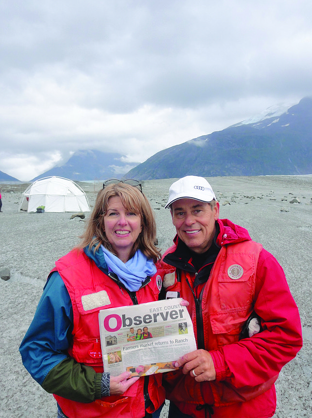 GLACIER GAZING. Lee and Rick Libro try to stay warm while standing atop Meade Glacier in Alaska.