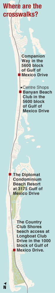 According to officials on Siesta Key, where crosswalks were built in 2013 on a beach road similar to Gulf of Mexico Drive, the crossings will improve safety in the long run. But in the short term, it will take time for both Key pedestrians and motorists to get used to the crosswalks this season.