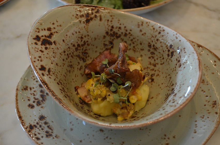 Local Honey Raised Pork Shank (Pork shank, blistered jalapeno creamed corn, crushed Yukon gold potatoes)