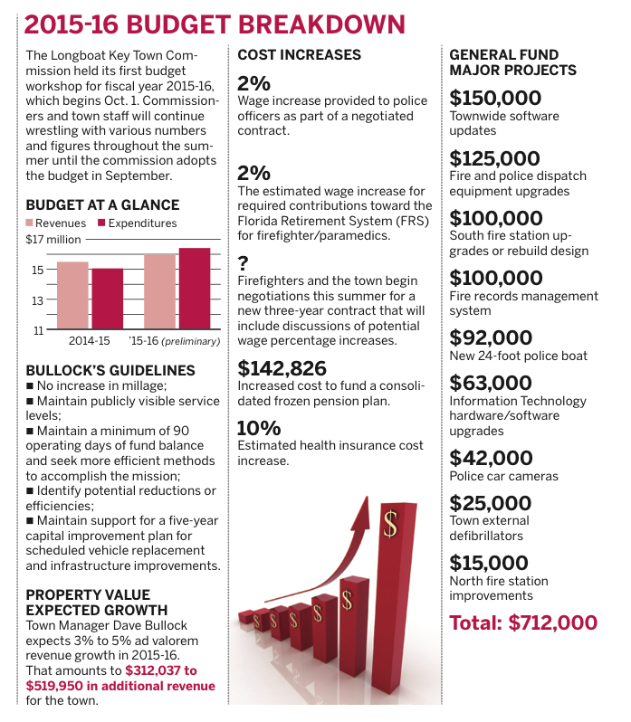 The Longboat Key Town Commission held its first budget workshop for fiscal year 2015-16, which begins Oct. 1. Commissioners and town staff will continue wrestling with various numbers and figures throughout the summer until the commission adopts the budget in September.