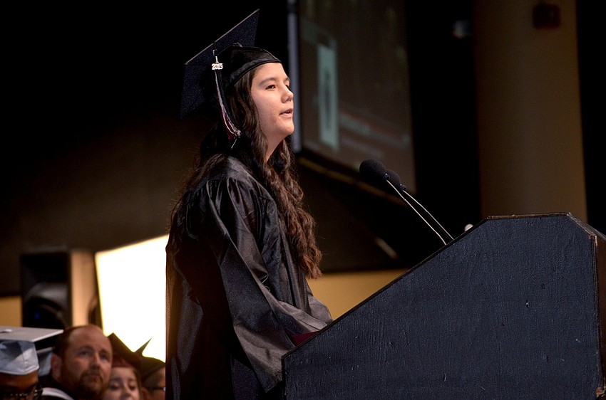 Braden River High School seniors tossed their caps and said goodbye to their East County school, May 30, at the Bradenton Area Convention Center. At their graduation ceremony, the Class of 2015 sported maroon, black or white robes, multi-colored chords for honors and other indicators of their high school performance. Brittany Cole, Ella Biggins, Emma Slotabec and David Espinal smiled through their speeches of lessons learned at Braden River, such as not stepping on the pristine grass and following the strict dress code policies, and delivered encouraging words of taking their post high school life by the reigns to pave a successful path for themselves as "adults" — a scary and strange word for students who just four years ago were mere freshmen, Cole joked.