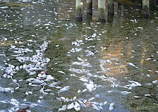 Strong easterly winds and currents brought a concentration of dead fish associated with red tide algae blooms into bayside canals and onto Beer Can Island.