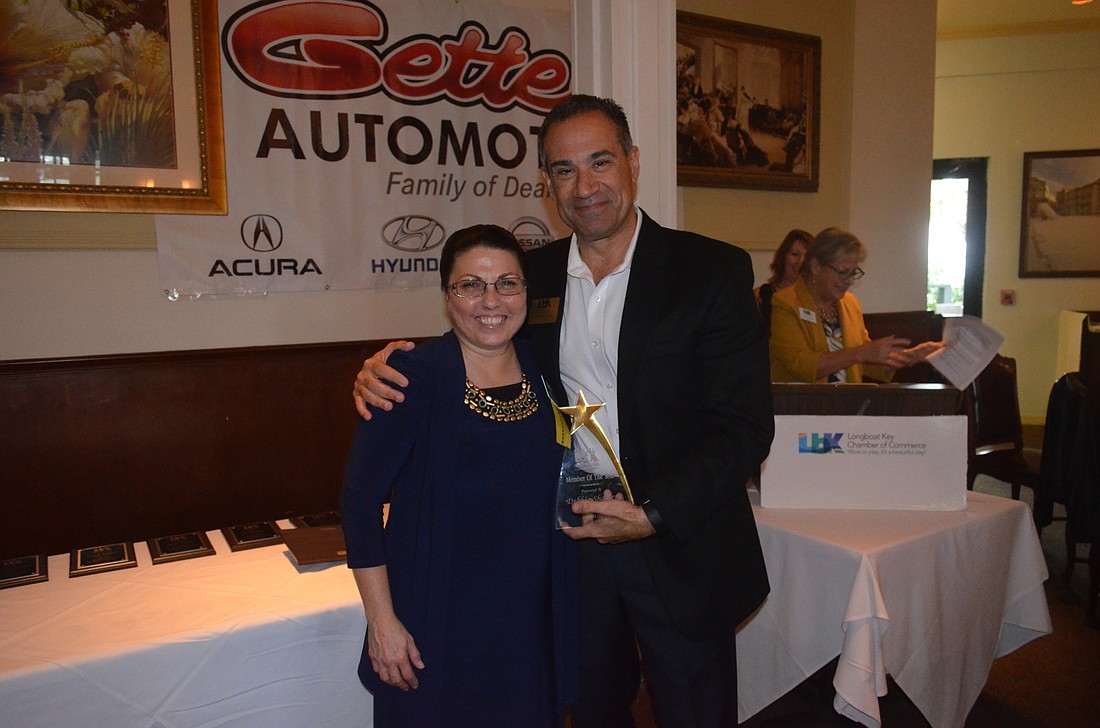 Chamber Member of the Year Debbie Shaffer, of Henson Mechanical, and 2015 Chairman of the Board Jeff Mayers, of the Resort at Longboat Key Club