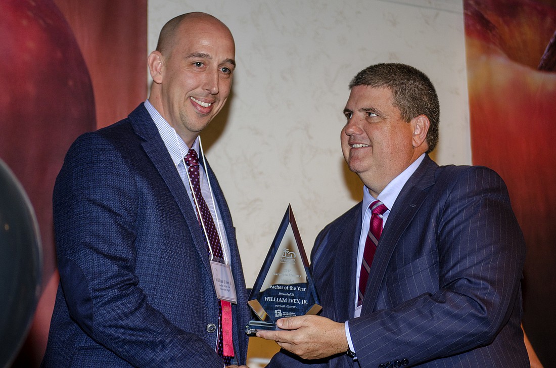 William "BJ" Ivey accepts the Sarasota County Teacher of the Year award from Superintendent Todd Bowden.