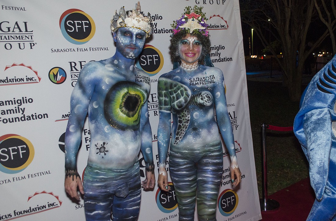 Models in Sarasota Film Festival body paint pose on the red carpet at Sea and Be Scene on April 7 at J.D. Hamel Park.