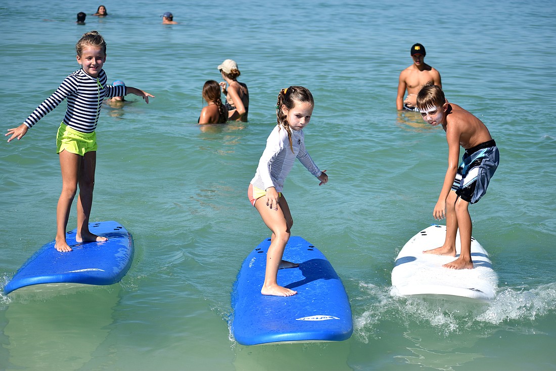 Mia Freeman, Gigi Tuffile and Connor Helrigle test their surfing skills during Sarasota County’s Skim, Surf and Paddle Camp on June 28.