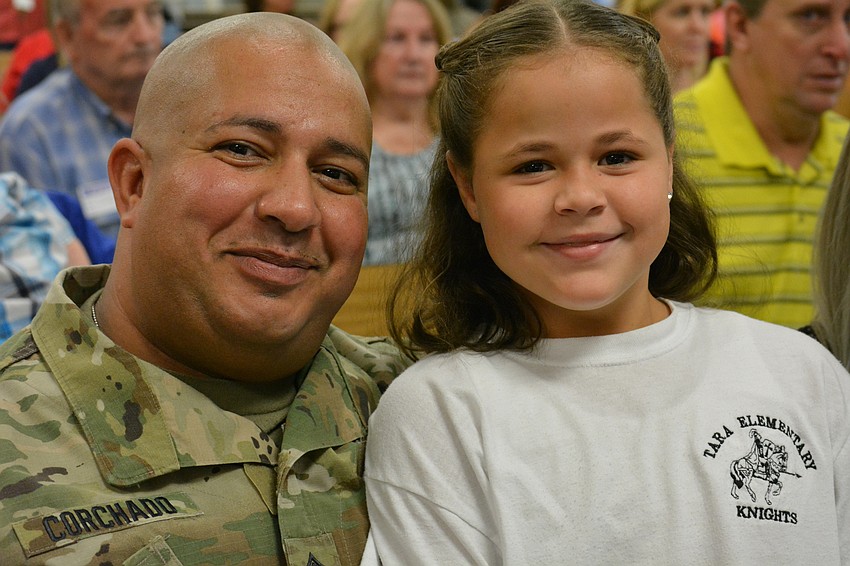 Tara staff member Maria Rodriguez and parent Sgt. 1st Class Alberto Corchado stand as students recognize veterans and military servicemen in the audience.