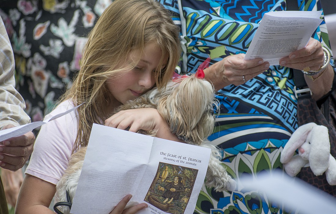 Mila Villaveces pets Tadler before the pet blessing at Church of the Redeemer on Oct. 1