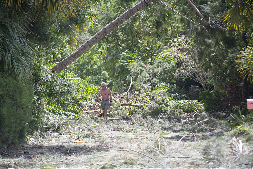 Trees fell during the storm and blocked the entrance to the Point Crisp neighborhood of South Siesta Key. But that wasn’t stopping Harry and Mary Goodan. After climbing through the branches, the couple waded through several inches of standing water to walk the quarter-mile to their home. Meanwhile, a private contractor started removing the trees.