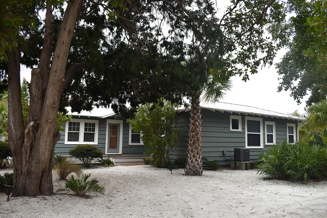 Located at 6909 Longboat Drive S., the exterior of the home is painted a dark green that blends in nicely with the surrounding trees and fits the ambiance. A front porch invites guests to sit before entering the home.
