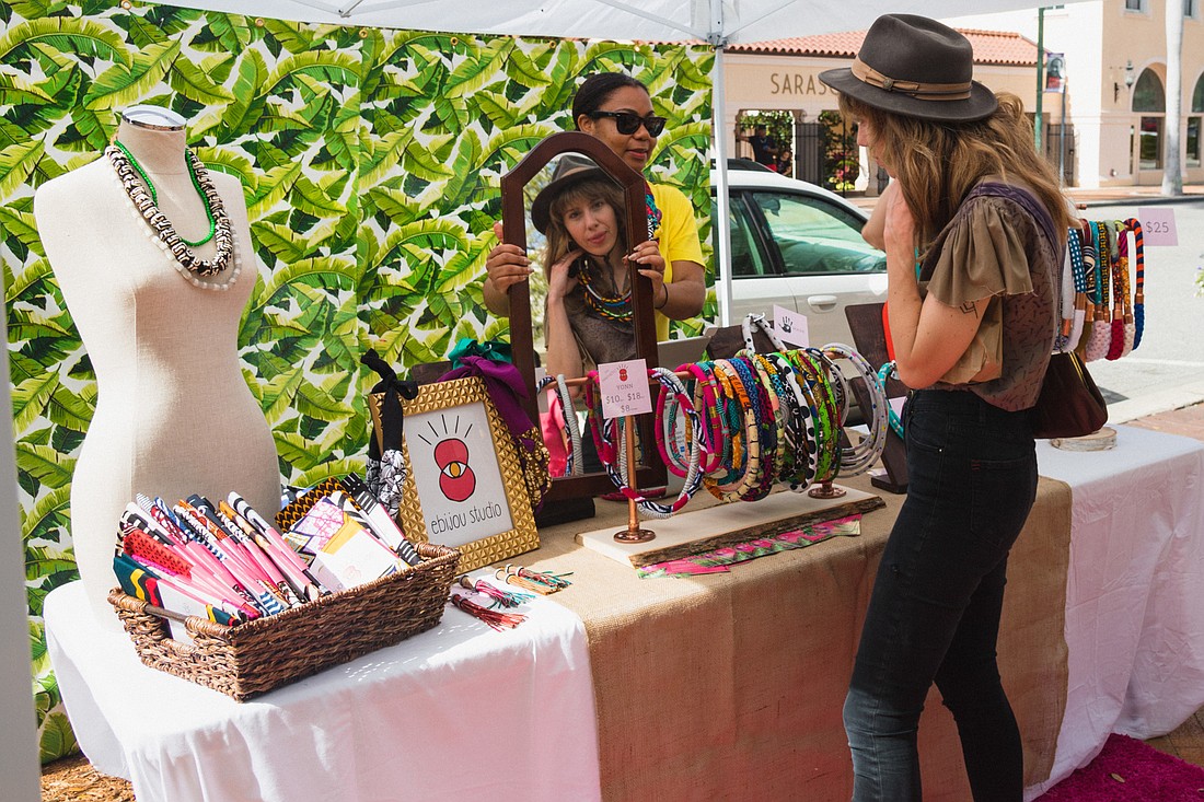 Erin Murphy tries on a necklace from Elma Felix-Lamontagne's Ebijou Studio booth.