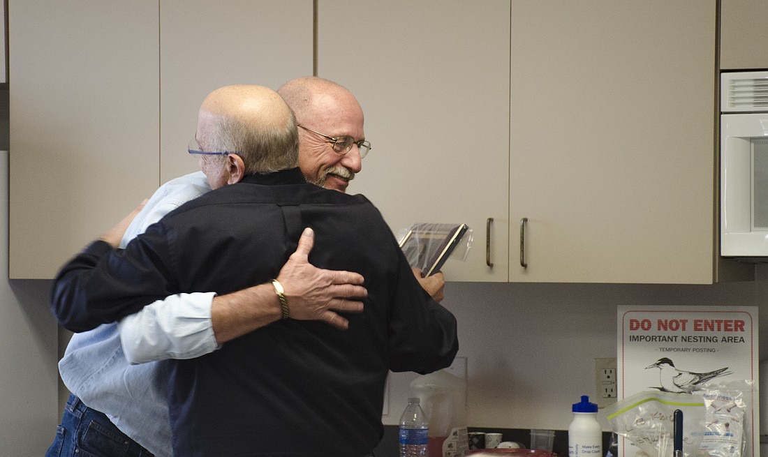 Project Manager James Linkogle (left) and former Public Works Operations Manager Neal Martin both gave speeches at Juan Florensa's going-away party.