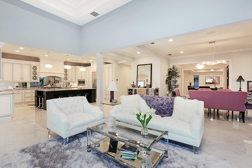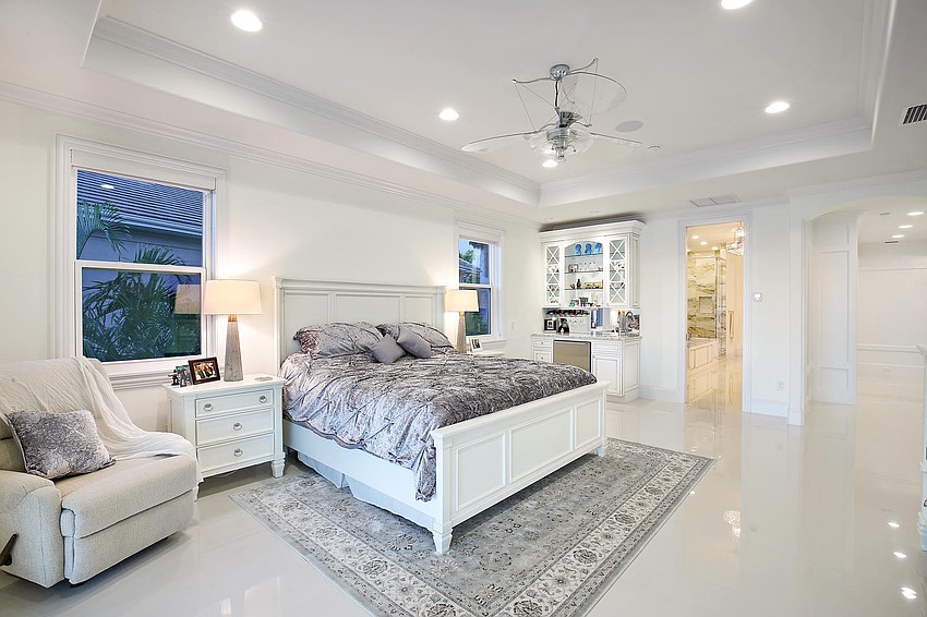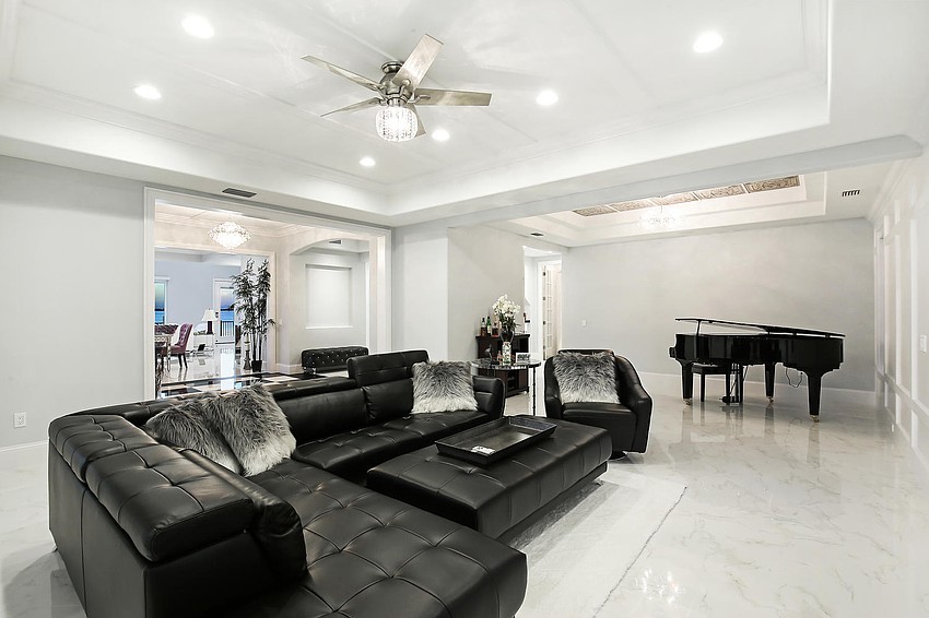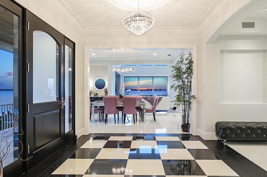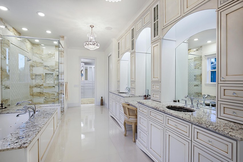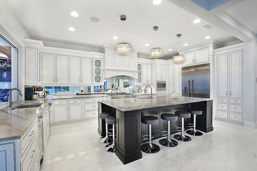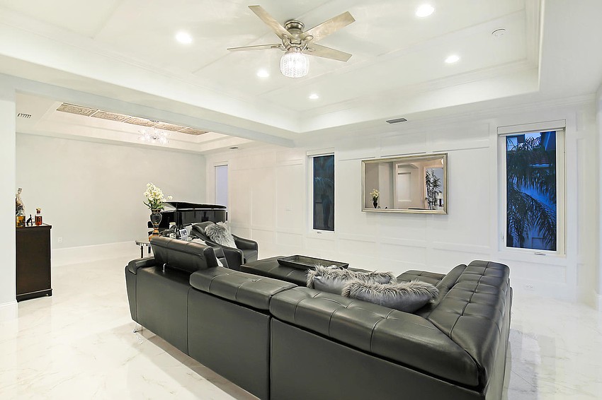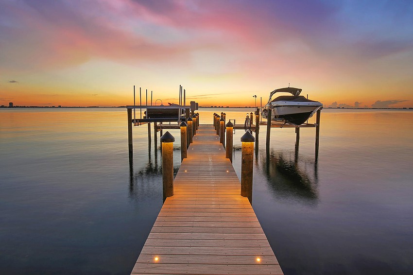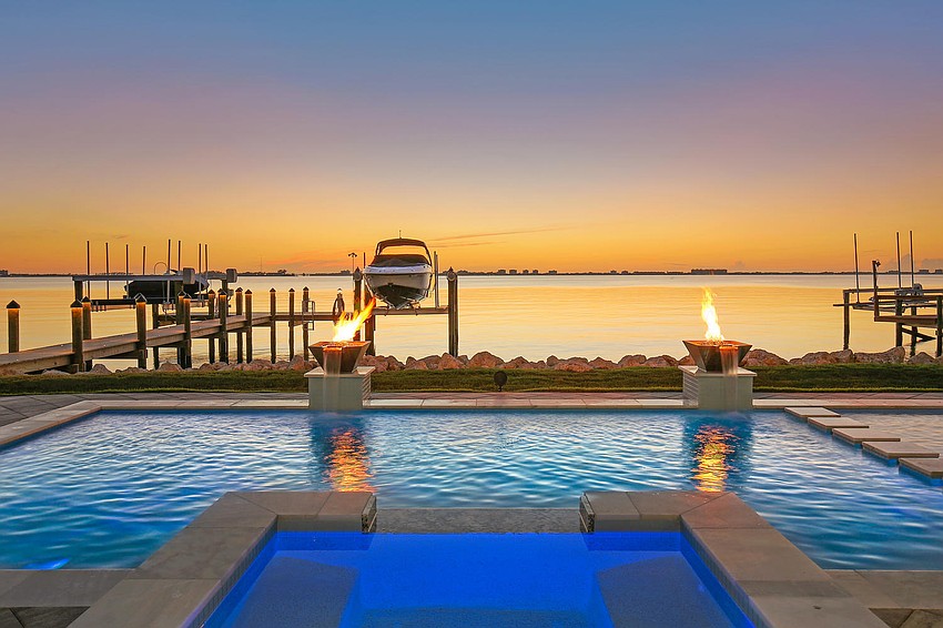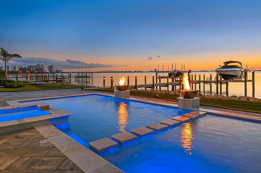 The three-floor home features expanses of glass to preserve views and allow the home to flow seamlessly to the outdoors. The pool and spa outside is adorned with twin fire bowls, a master suite sitting area with multicolor LED backlit fireplace and a fire pit area. The property also features a deepwater dock with 14,000-pound and 10,000-pound boat lifts.