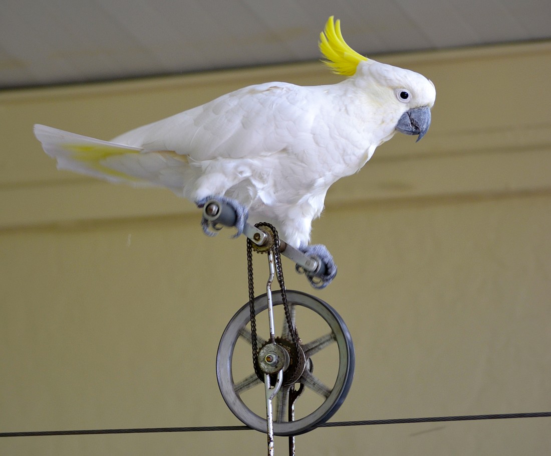 Frosty’s biggest stunt is hopping aboard a tiny unicycle that he pedals along a wire tightrope while carrying a fellow exotic bird suspended on a trapeze below. He is also adept at navigating around in his tiny scooter.