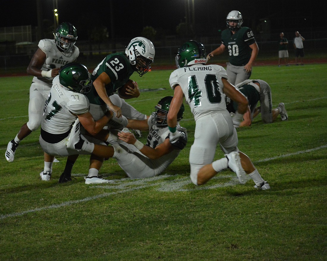 Theriot had 25 carries for 18 yards, finding no room to run through the teeth of the Venice defense. The Indians also strip-sacked Theriot on a rare drop back in the second quarter and returned the fumble for a touchdown. Venice began playing its backups toward the end of the second quarter, and the game's halftime score was 51-0. The second half was played with a running clock.Â