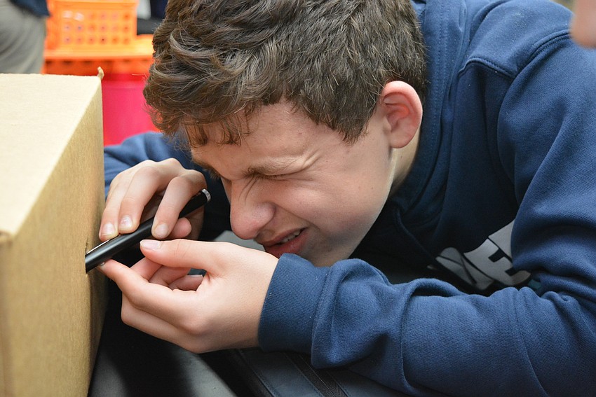Thirteen-year-old Lauren Dalton uses a scope in a box to try to figure out its contents.