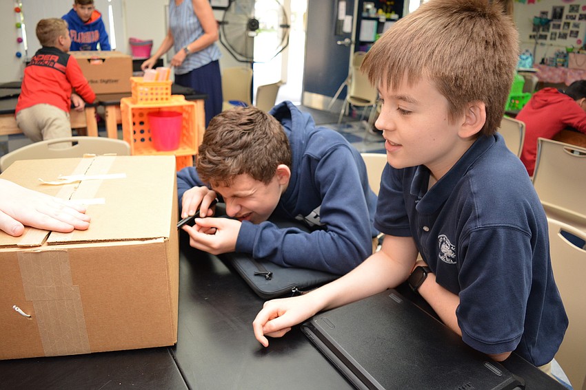 Twelve-year-old Marty Gomien, front, tries to figure out what an animal "ate" in a simulation as 13-year-old Nathan Crosby watches.