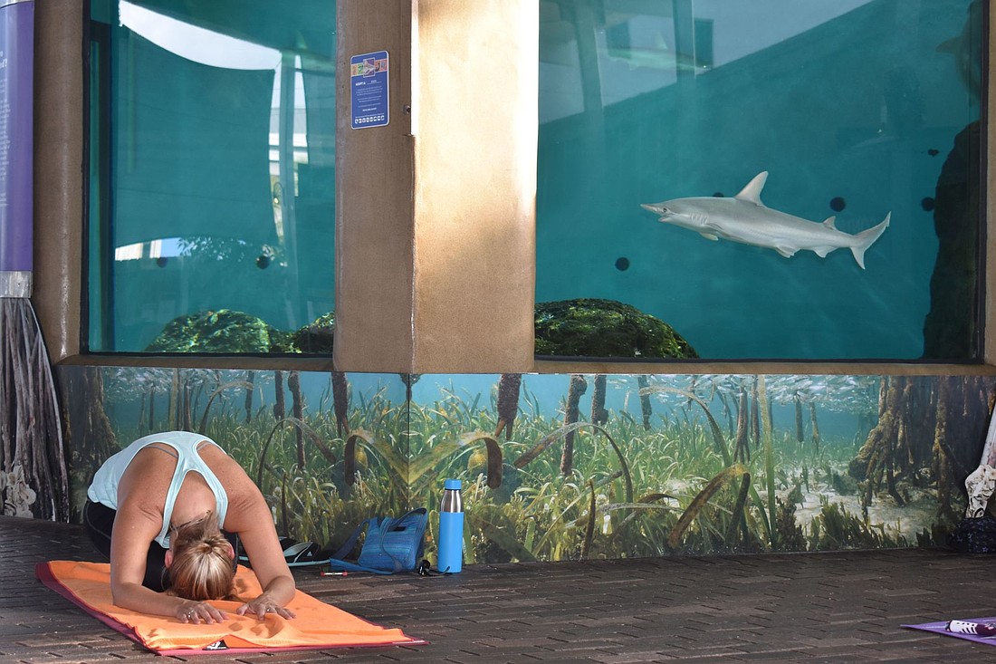 Ocean flow? Always. Yoga flow? Just on Saturday morning as part of the aquarium’s Shark Days events. About three dozen people gathered for Yoga with the Sharks, laying out yoga mats among the aquarium exhibits.