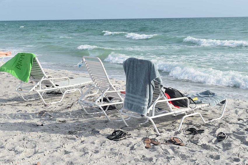 Dragged down from the SeaHorse Beach Resort, these chairs hold a family's place while they stroll along the beach.