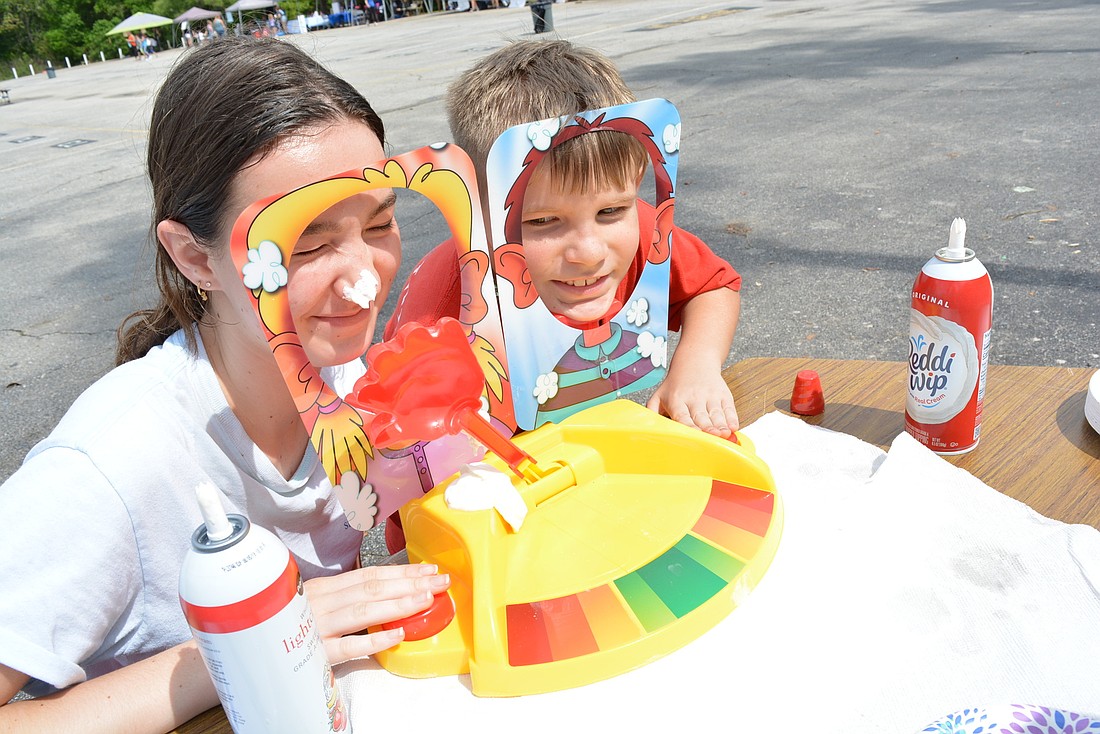 Students for Safety Club member Marissa Briggs, a sophomore, takes a pie in the face for the cause after losing "Pie Face!" to 7-year-old Jaxon Miklavic.
