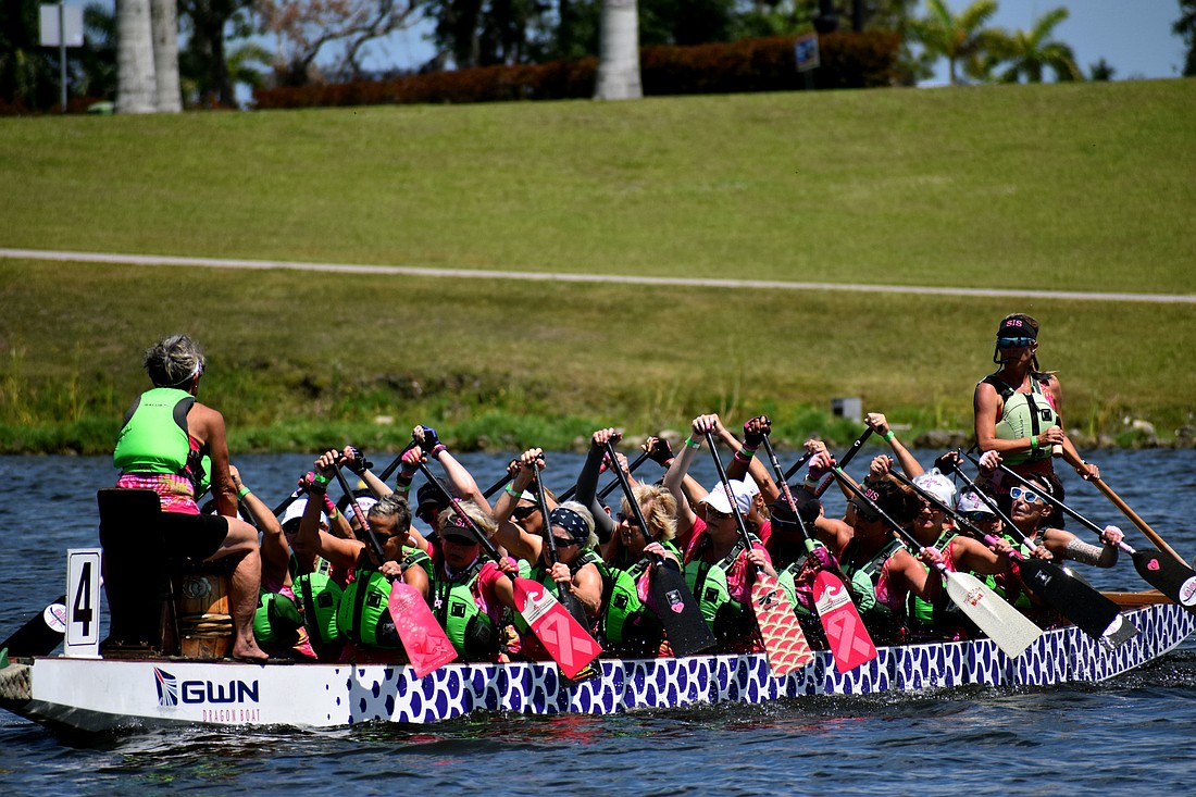 The members of Survivors in Sync, a dragon boat racing crew comprised mostly of breast cancer survivors, had just won their 500-meter heat in the annual Dragon Boat Festival. They pulled up to the dock and made their way through the crowd, giving high-fives and hugs along the way.