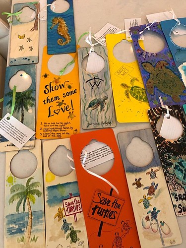 Hathaway was an artist, educator and avid turtle protector. Her artisan friends from Sarasota Urban Sketchers painted 20 door hangers reminding folks to turn out the lights and protect sea turtles and joined the Turtle Watch to pass them out to people at the Farmers Market and keep Hathaway's legacy alive.