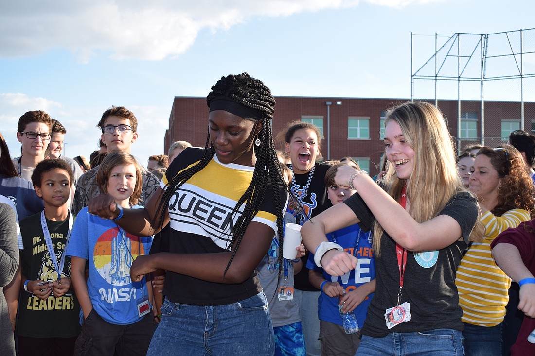 Laila Ward and Caitlyn Webb, both eighth-graders, lead a group of students during a school-wide dance party at the end of the walk-a-thon.