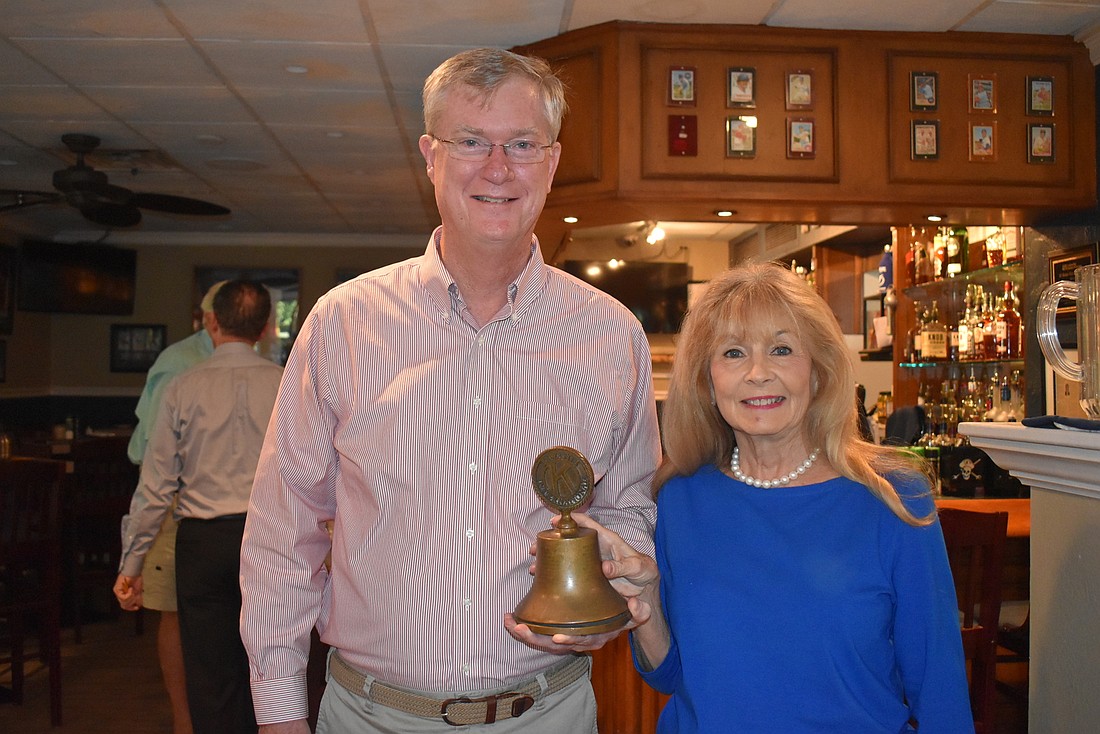 Branham passed the Kiwanis bell to Larson in lieu of the gavel, which is stored away for now, at the club’s breakfast meeting at the Lazy Lobster. Vice president Michael Garey, owner of the restaurant, balanced his duties as he helped serve fellow members and speak to the club.