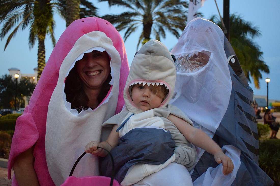 Lakewood Ranch residents Vaughna Wells, Kaija Thoyre, 16 months, and Sam Thoyre dress as sharks because Kaija's favorite song is "Baby Shark." The family sings it twice per day, and it is part of Kaija's bedtime routine.