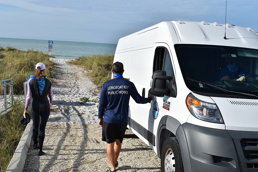 Longboat Key projects manager Charlie Mopps and Public Works officer manager Alex Lowe-Mains assisted in Violet's release at the 4001 Gulf Mexico Drive public beach access point across the street from Bayfront Park.
