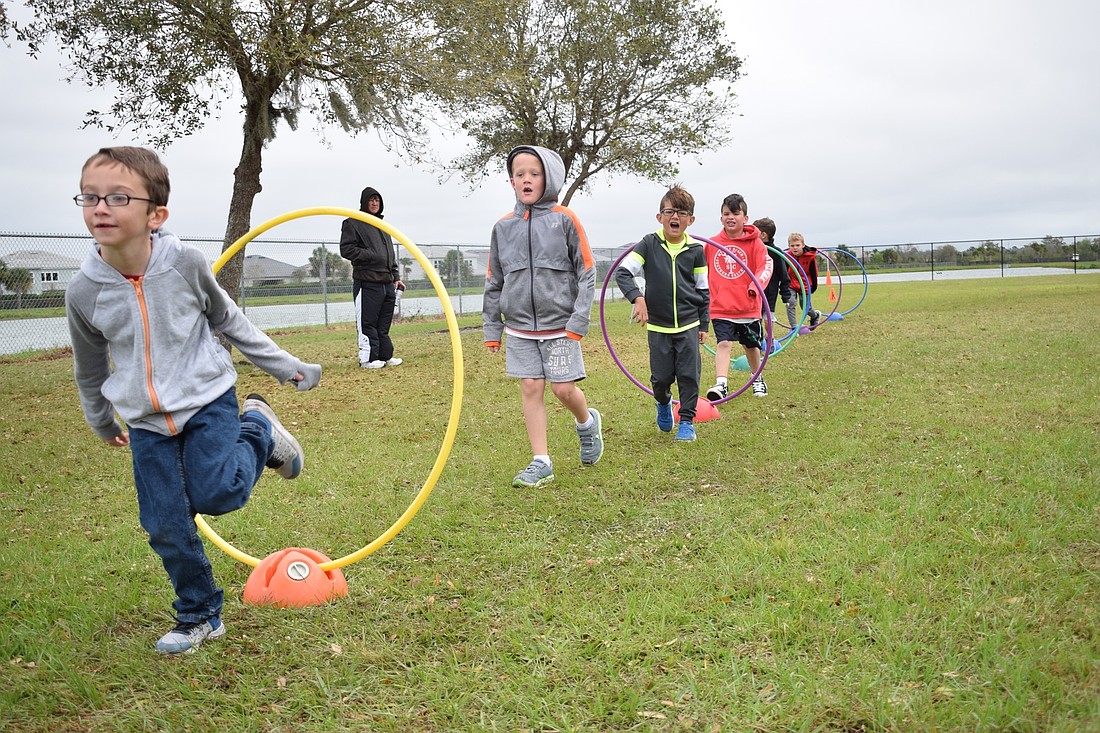 First grader Jaden McQueen walks through a Hula Hoop. "I like that we get to run and have Kona Ice," McQueen says.
