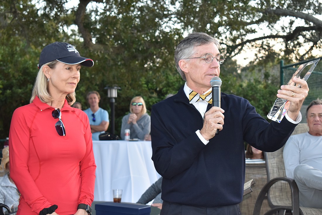 In addition to the happy reunions, Thayer was recognized for her 20 years with the tennis center in a short, surprise ceremony. Observer Media Group CEO Matt Walsh presented Thayer with a glass award for her longtime work, speaking to her accomplishments.Â