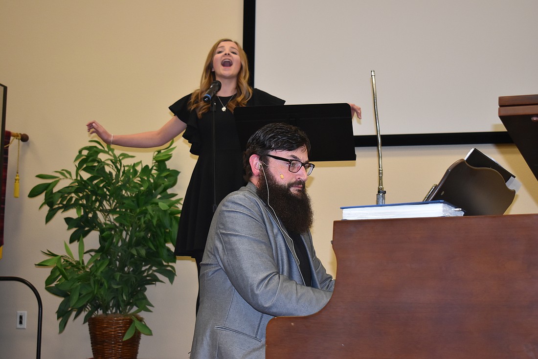 Congregants and guests gathered to dine on dozens of dishes and desserts before settling in to watch Jeremy Silverman, organist and pianist, and four guest student singers from his theatrical performances in Tampa. High schoolers Stella Curry, Jessica Hill and Maddie Bain wowed attendees with their larger-than-life voices accompanied by Silverman on the piano.Â